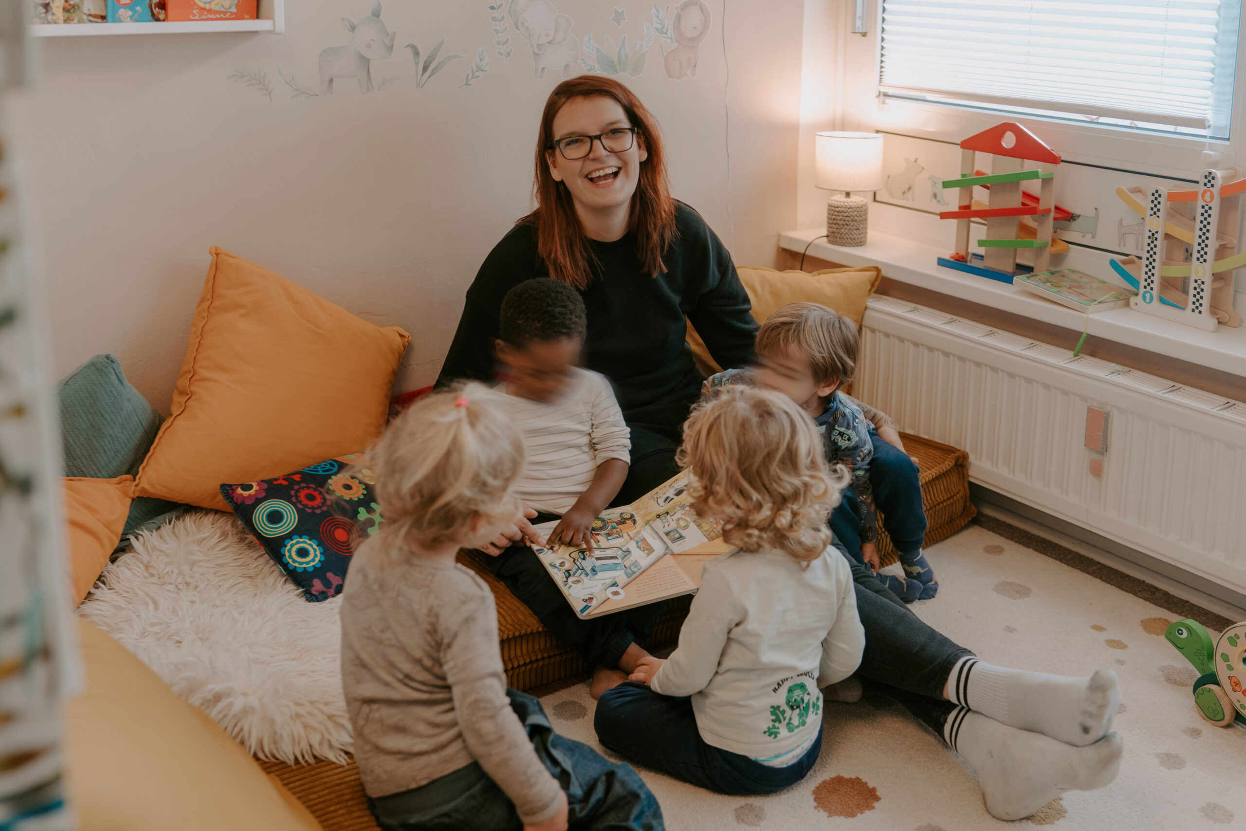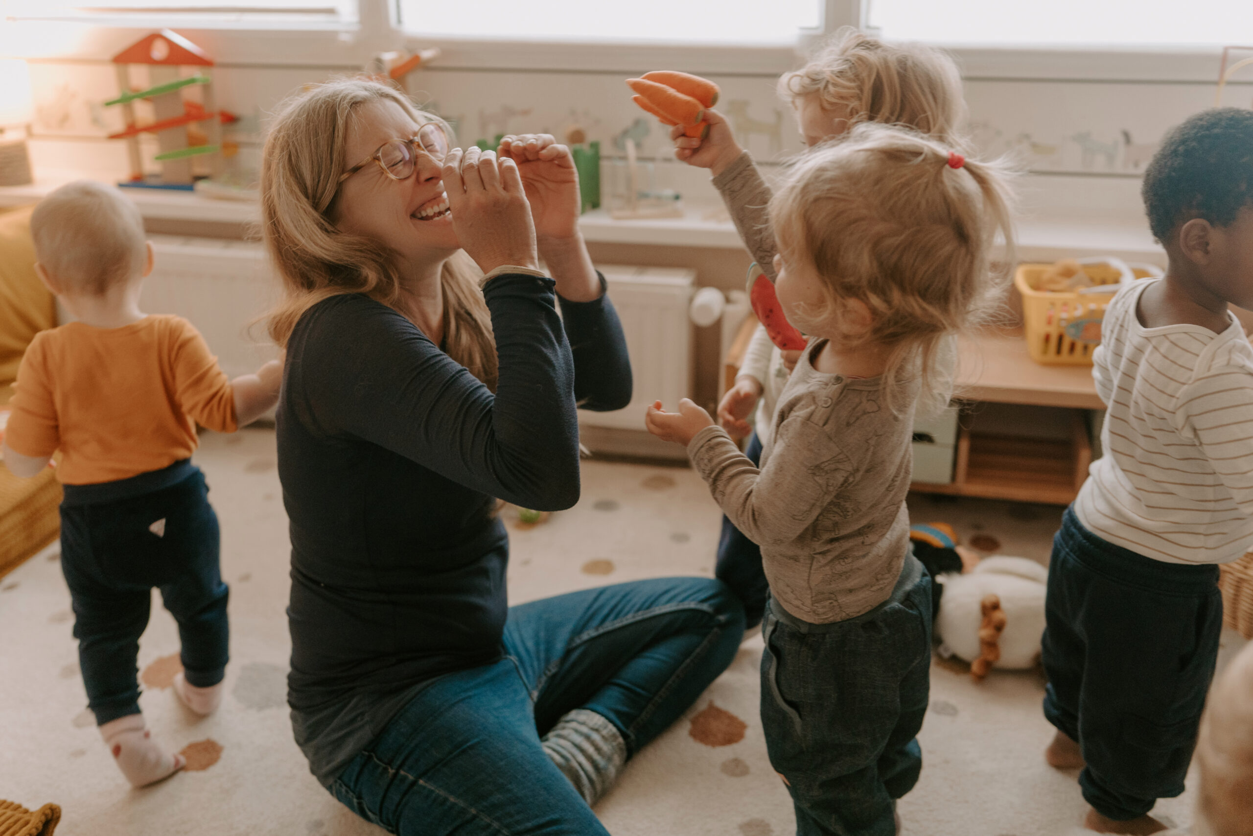 Die sprachliche und motorische Entwicklung fördern wir mit Singkreisen, Fingerspielen, Vorlesen sowie Tanzen, Toben, Turnen und vielem mehr.
